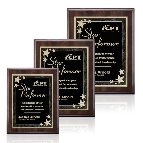 Elevate recognition with the Farnsworth/Starburst Cherry/Black plaque, a symbol of excellence and achievement. Crafted with a lustrous cherry wood finish, this plaque stands as a testament to dedication and success. The high-contrast black and gold design with starburst accents adds a touch of sophistication, perfectly framing the solid brass plate that awaits your personalized engraving. Versatile in its use for various awards, it is offered in three sizes, each providing ample space for custom messages and accolades. Ideal for celebrating milestones, this plaque is sure to impress and inspire, making it a cherished keepsake for years to come.