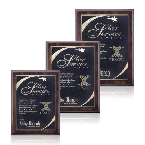 Enhance your recognition program with the Farnsworth/Birchcliff - Cherry/Black plaque, distinguished by its classic cherry finish that brings a touch of sophistication to any setting. The velvety black plate edged with solid brass frames your message of appreciation in undeniable style, complemented by a shimmering star motif that signifies excellence and achievement. With options for both vertical and horizontal orientations, this plaque ensures a perfect fit for your personalized message or logo, artfully laser-engraved for permanence. Ideal for celebrating milestones, this plaque transforms your accolade into a lasting emblem of success and appreciation.