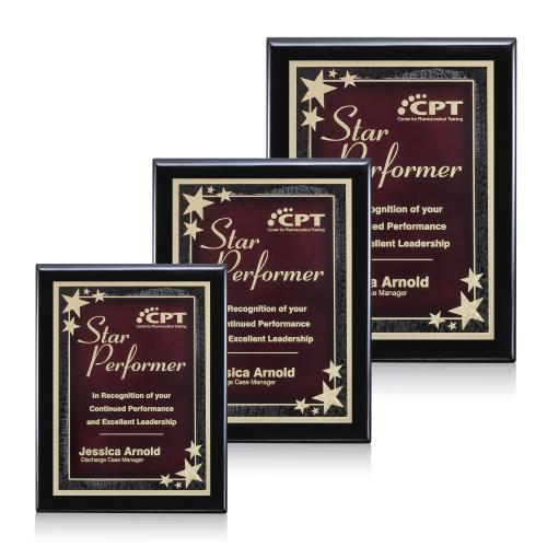 Enhance your recognition program with the Oakleigh/Starburst plaques. These awards exude sophistication with their high-gloss piano finish and contrasting red accent. Available in three sizes and colors, these plaques are perfect for celebrating achievements at every level. The subtle starburst pattern frames personalized laser engravings, spotlighting individual excellence with elegance. Whether acknowledging a 'Star Performer' or commemorating a career milestone, these plaques offer a timeless tribute that recipients will display with pride. Elevate the standard of excellence in your organization with this distinguished selection.