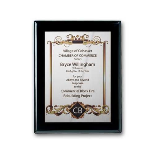 Digitally reproduce your artwork in full color on a silver plate, mounted to our ebony piano finished wood plaque.
