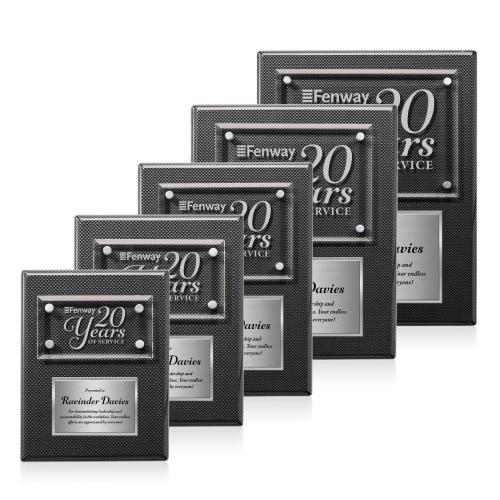 The contemporary and bold look of the Gossamer Wall Plaque will shine a spotlight on your special achievement. Features beveled Starfire Crystal with with deep etch and one color and offset from a solid piano finished carbon fiber backing. Includes a two tone, brushed and polished silver double plate.