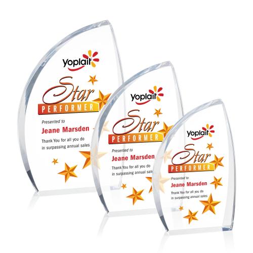 The Duncan VividPrint Award features solid clear acrylic that reveals a curved shape that flows into a peak on the side of the award. The perfect vessel to show your appreciation for any sector and any occasion! Let your message POP! with full-color VividPrint.