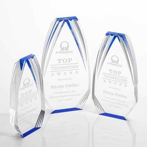 The Lantana Blue Acrylic Award stands as a testament to achievement, its bold sapphire base infusing the entire piece with a subtle yet mesmerizing glow. Perfect for personalization, the laser engraving ensures your message of appreciation is etched with precision, creating a lasting impression. The award's sleek, tapered design culminates in finely crafted ridges, adding a refined touch to any celebration of success. With its inclusion in a luxurious black satin-lined presentation box, the Lantana Award is not just a symbol of recognition, but a cherished keepsake that honorees will display with pride.