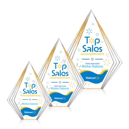 The Acrylic Brantley VividPrint Award is a bold, freestanding piece featuring a tall diamond shape with dramatic multi-layered, stepped edges that create a striking sense of depth and light reflection. It's clean, open center provides a premium canvas for engraving or full-color artwork, while the beveled acrylic frame adds modern architectural flair from every angle. Available in Clear, Gold, or Sapphire accents, the Brantley is a standout choice for top sales, leadership, and milestone recognition. Bring your artwork to life with full-color VividPrint!