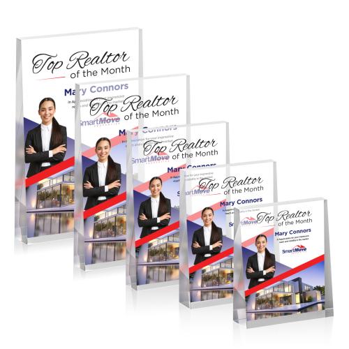 The Lansing VividPrint Award is a thick freestanding acrylic award that tapers to the top and provides a large etch area to design an inspiring recognition piece. A good fit for the real estate industry! Available in Horizontal or Vertical, Deep Etch or VividPrint.