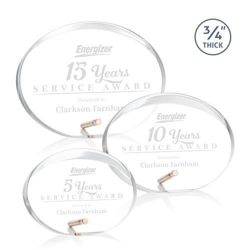 The Rawlins Acrylic award features a 3/4" thick oval design with a beveled top half and your choice of gold or silver easel pin. A budget-busting award that's perfect for recognizing an exceptional achievement or momentous milestone.