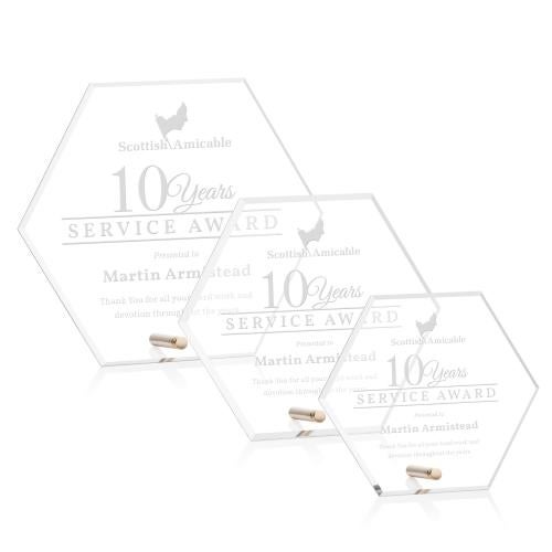The Polaris Hexagon Award features a beveled acrylic hexagon, perched upright with a gold or silver easel pin. The Polaris series of awards are great budget-busting options for recognizing an exceptional employee or a corporate milestone.