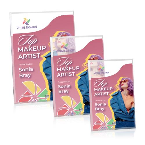The Polaris Rectangle VividPrint Award features a beveled acrylic pane, perched upright with a gold or silver easel pin. The Polaris series of awards are great budget-busting options for recognizing an exceptional employee or a corporate milestone.