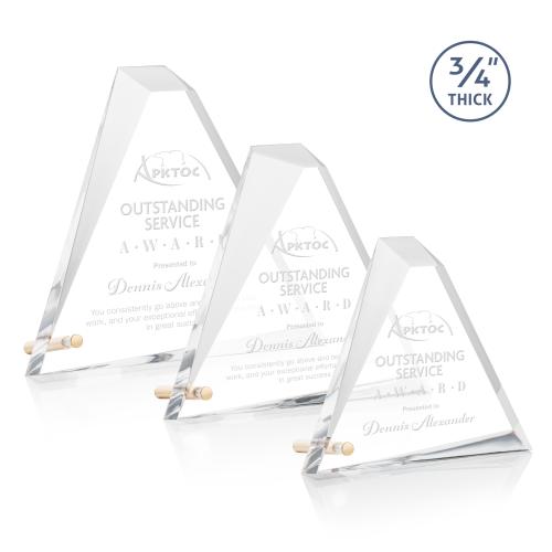 The acrylic Mosaic triangle award is 3/4" thick and perched upright with a gold or silver metal pin at the corner. Beautifully tapered with deep facets to create a unique geometric pyramid design.