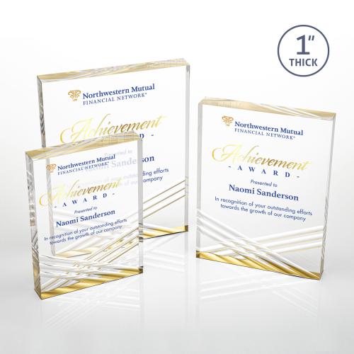 The Chestham Acrylic Award is a striking monument of achievement recognition. A thick freestanding Acrylic tombstone with crisscrossing grooves that reflect a beam of shimmering gold from the base. Let your imagination run wild with full-color VividPrint.