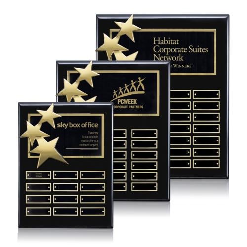 Elevate the honor of achievement with the Constellation (Vert) Perpetual Plaque in Black/Gold, a symbol of ongoing recognition. The high-gloss piano finish accentuates the richness of the rosewood or ebony backing, providing a luxurious backdrop for the shimmering constellation stars and engraving plates. Tailor this piece to commemorate corporate milestones or team accolades, as it assures a lasting legacy with options for 12, 18, or 28 individual plates to acknowledge multiple recipients over time. Perfect for yearly awards or monthly acknowledgments, this plaque transforms any wall into a gallery of excellence, inspiring ambition and acknowledging success with each glance.
