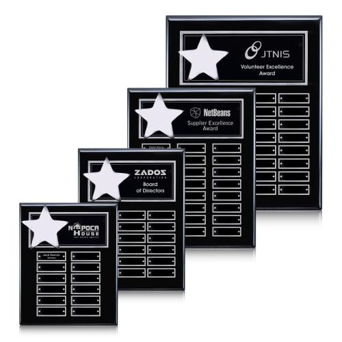 The Hollister (Vert) Perpetual plaque in black with silver accents exudes elegance and prestige, making it the perfect choice for recognizing milestones and achievements. Available in a lustrous high-gloss black finish paired with either gold or chrome detailing, this plaque offers a seamless blend of sophistication and modern design. Whether acknowledging a volunteer's dedication, celebrating supplier excellence, or marking a board member's contribution, the shimmering star feature and cleanly arranged perpetual plates provide ample space for personalization. The laser engraving method ensures that each name and title is etched with precision, creating a lasting tribute to excellence that is both prominent and tasteful.