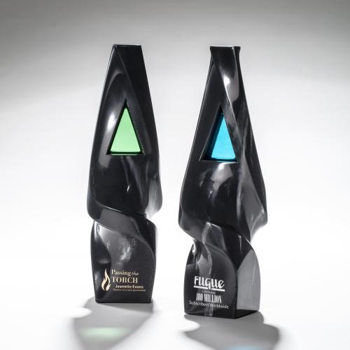 The Colossus is a large, dramatic Stonecast obelisk with swirling movement from the bottom to the top of the award. The black marble finish features a cathedral window of either blue or green art glass.