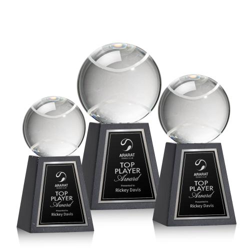 Elevate your recognition game with this distinctive Tennis Ball Spheres on Tall Marble Base Crystal Award, the quintessence of elegance and sporting spirit. Each sphere, suggestive of a tennis ball, sits majestically atop its tapered jet-black marble pedestal, awaiting the honor of bearing a champion's name. The clear crystal captures and bends light, portraying the dynamism and energy of a tennis ace in action. Ideal for engraving, this award offers a blank canvas to express heartfelt congratulations and immortalize a player's victory. With its refined craftsmanship, it stands out as the trophy of choice for those who appreciate the beauty of the game as much as the skill it demands.