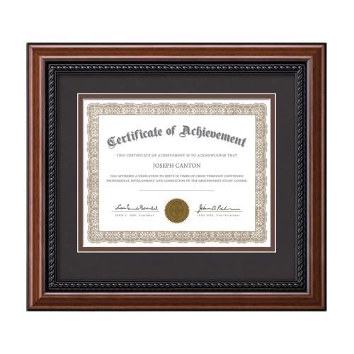 The rich mahogany finish of the Weyden certificate wood frame is enhanced with an ebony stained carved rope accent. The wood frame is enhanced with a double matte of dove grey and navy to display your certification with old world charm.