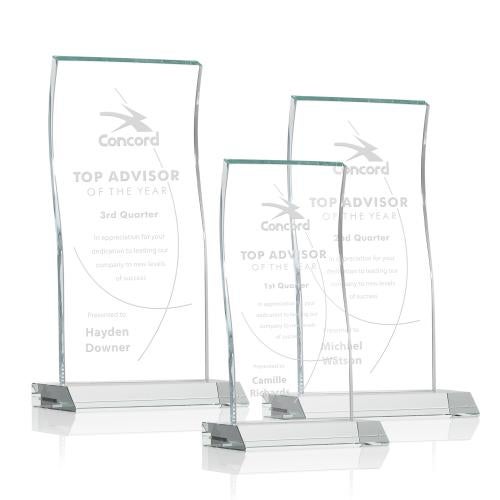 Tall Vertical 0.5" thick Starfire Crystal Tower that elegantly curves and arches near the top to create a striking recognition piece to highlight your momentous achievement. Available in 3 sizes and 8 distinct front mitered Colored Crystal Bases.