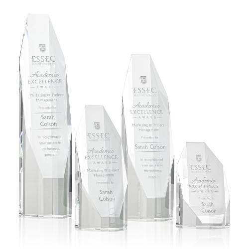 The exquisite Barrhaven Optical Crystal Award features a tall multi-faceted obelisk with a sheered-off octagonal front that creates a stunning diamond-shaped surface to inscribe your exceptional achievement.