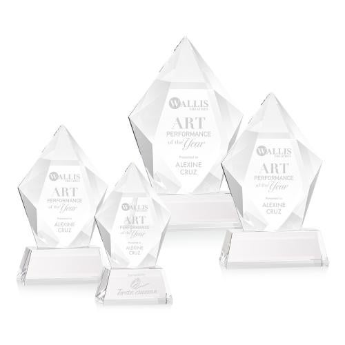 The spectacular and sparkling Devron Award features a thick Optical Crystal pentagon with deep facets creating a halo for refracted light around your inspirational words of achievement. Mounted on a tall tapered optical base in your choice of 8 distinct colors. Second position etch and colorfill optional.
