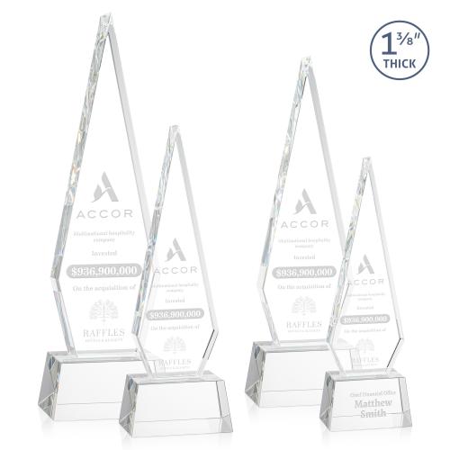 This Optical Crystal Springfield Award on base features an elongated, tall diamond-shape, standing **1 3/8 inches thick.** The sleek design exudes elegance and sophistication, making it an eye-catching centerpiece for any display. Its flawless clarity and precision-cut edges reflect light beautifully, highlighting the craftsmanship and significance of the accolade. Available with various bases. 2nd position etching optional.