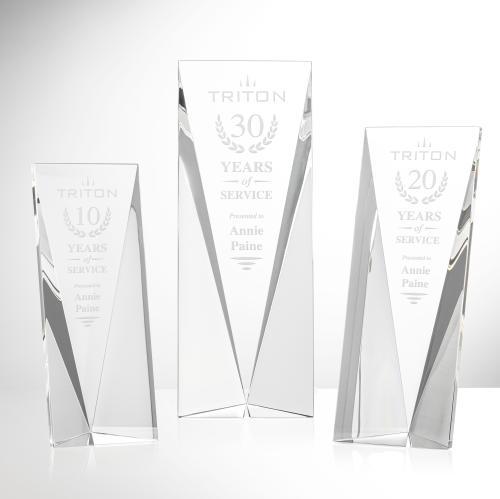 The Freestanding Optical Crystal Columbus Award boasts a striking design with a flat, slightly slanted front and back, while its two sides converge inward towards a pointed base. Triangular shapes create a mesmerizing visual effect, making the award a standout piece. Light beautifully refracts through the cuts of the crystal, adding a touch of elegance and brilliance to any recognition event.