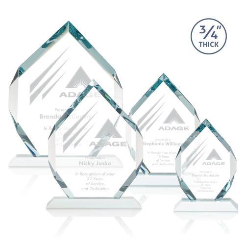 The Royal Diamond is a symmetrical six-sided Starfire award with constant-width bevels on the front top and bottom sides and on the back middle sides. The prominent, highly polished bevels accentuate the sparkle of the glass, generate diverse and attractive reflections along the edges, and frame the central etching area.