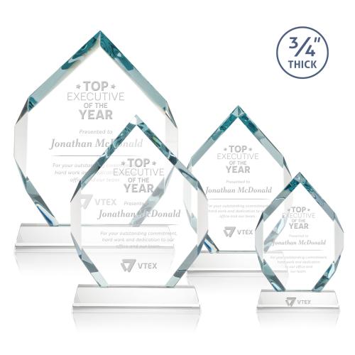 The Royal Diamond is a symmetrical six-sided Starfire award with constant-width bevels on the front top and bottom sides and on the back middle sides. The prominent, highly polished bevels accentuate the sparkle of the glass, generate diverse and attractive reflections along the edges, and frame the central etching area. Mounted on a tall tapered optical crystal base. Second Position Etch Optional.