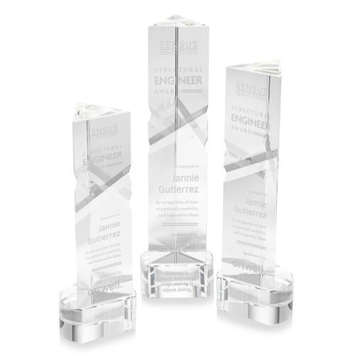 The Optical Crystal Oakham Award on base features a unique and striking design with deep, interchanging facets that catch and reflect light beautifully. Crafted from high-quality optical crystal, this award offers a sophisticated and elegant way to recognize exceptional achievements. Its unique triangular shape and impeccable clarity make it a standout piece for any ceremony or display. Second-position decoration on base optional.