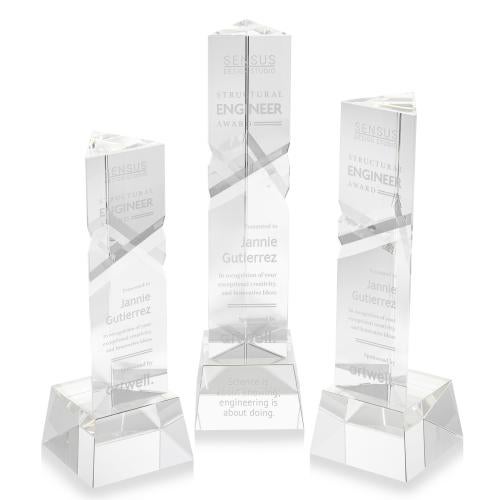 The Optical Crystal Oakham Award on base features a unique and striking design with deep, interchanging facets that catch and reflect light beautifully. Crafted from high-quality optical crystal, this award offers a sophisticated and elegant way to recognize exceptional achievements. Its unique triangular shape and impeccable clarity make it a standout piece for any ceremony or display. Second-position decoration on base optional.