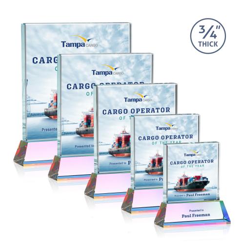 A solid pane of thick 0.75" Starfire Crystal is mounted on a tall tapered Starfire base in your choice of 8 distinct colors. A great choice for corporate recognition and to honor an exceptional achievement. 2nd position VividPrint optional.