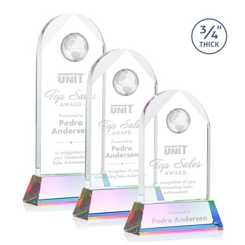 The Starfire Crystal Blake Globe Award features an elegant beveled arch with an Optical Crystal Globe mounted at the top. Includes a tall tapered Optical Crystal base in your choice of 9 distinct colors. A brilliant sparkling display for your achievement. Second Position Etch & Colorfill Optional.