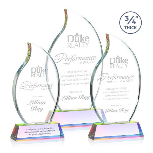 The Croydon award features an elegant 3/4" thick Starfire Crystal flame to commemorate your achievement with an eternal symbol of greatness. Mounted on your choice of 9 sparkling colored Newhaven bases. Second position etch optional.