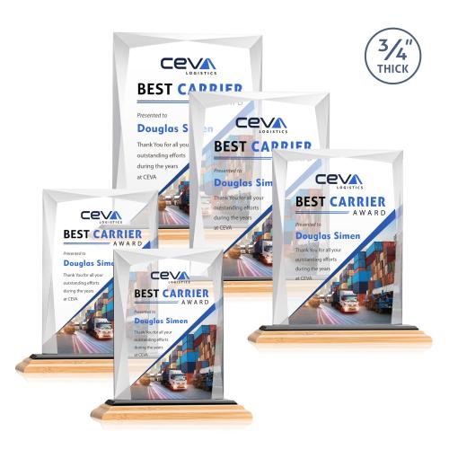 A staple of the recognition industry, the Messina is a striking award in thick 3/4" Starfire Crystal. Featuring brilliant interchanging bevels that create a beautiful frame of refracting light for your special achievement. Mounted on a triple-stepped bamboo base. Let your artwork shine with full-color VividPrint!