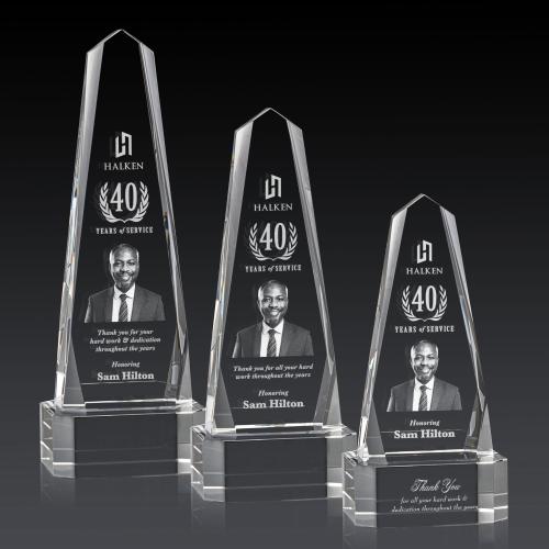 The Optical Crystal Geneva 3D Award is an obelisk that features a mesmerizing design with interchanging bevels, lending it a dynamic and captivating appearance. Each facet catches and reflects light, creating a dazzling display that symbolizes the multifaceted nature of success. Mounted on an extra-thick optical base in your choice of clear, emerald, sapphire or ebony. Take our deep etch process even deeper with our incredible subsurface Dimensions 3D Engraving.