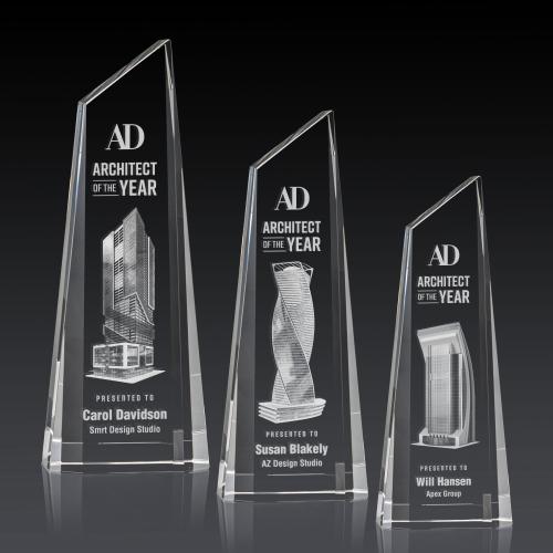 This stunning trapezoidal tower award is anchored with a thick optical crystal bottom that tapers to a peak. Experience a new glimmer of radiant light at each angle of this exquisite crystal award. Take your deep etched artwork even deeper with our incredible subsurface Dimensions 3D Engraving!