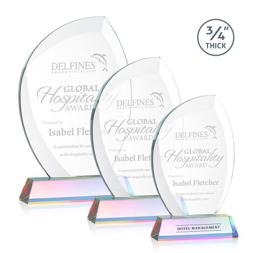 The Wichita Award features thick 3/4" Starfire Crystal with deep sweeping bevels that elegantly arch around your words of recognition with shimmering light. Mounted on a tall tapered Optic Crystal base in your choice of 9 distinct colors. A modern monument for any special achievement. Second Position Etch & Colorfill Optional.