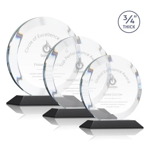 The Gibralter is a perfect 3/4" thick Starfire circle framed by a soft beveled edge that highlight your words of achievement. Mounted on beautifully mitered base in your choice of 8 distinct and vivid colors.