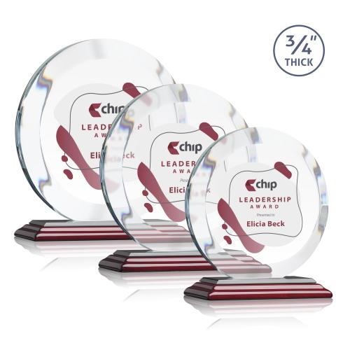 The Gibralter full color VividPrint Award is a perfect 3/4" thick Starfire circle framed by a soft beveled edge that highlight your words of achievement. Mounted on rosewood base.