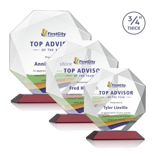 Spectacular Multifaceted 0.75" Thick Starfire Octagonal Award with deep recessed bevels forming a striking diamond design. Mounted on a mitered Red Crystal Base. Let your message POP with full-color VividPrint!