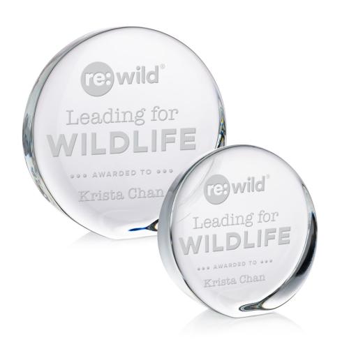 Tapered from top to bottom, the 3.5" glass Standing Disk in presents a backward sloping face to the viewer for maximum artwork visibility. A simple but attractive award for desktop or shelf, especially with large and bold artwork. Also available in a 4.5" version.