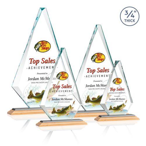 The exquisite Windsor VividPrint Award features a 0.75" thick Starfire Crystal diamond with sparkling bevels and is mounted on a triple-stepped bamboo base. A classic design that's perfect for corporate recognition. Take your artwork to new heights with full-color VividPrint! Various other bases are available!