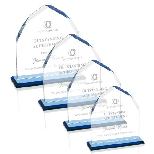 The Montibello Award features an exquisite Starfire upright with interchanging front and back facing bevels, mounted on a beveled sky blue Starfire base to create a striking award.