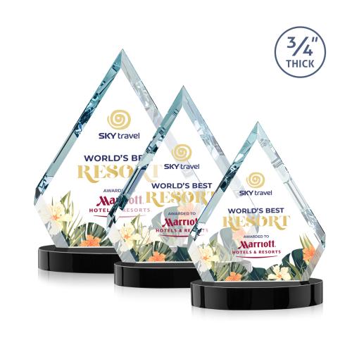 The sparkling Apex award features a 0.75" thick Starfire Crystal diamond with interchanging bevels that illuminate the inscription within. Mounted on an oval Alberton Crystal Base, the striking Apex award is the pinnacle of achievement recognition. Let your message POP with full color VividPrint.
