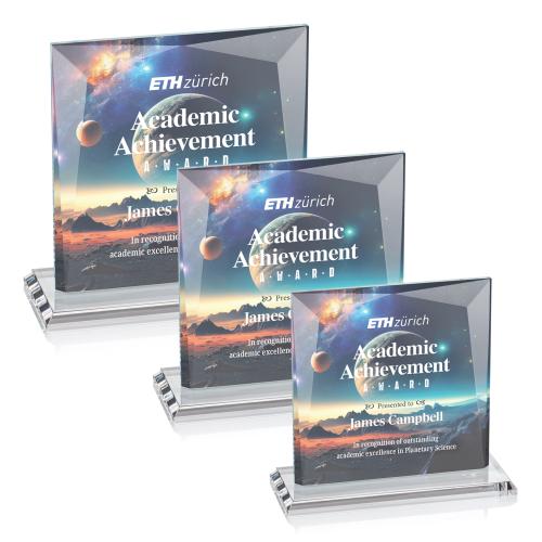 Brilliant award in 3 sizes features a 0.75" thick Starfire Crystal and deep divergent bevels to create a striking work of recognition. Mounted on a thick colored mitered base. Enhance your artwork with full color VividPrint!