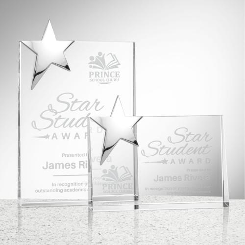 The Denham Star Award is a thick, freestanding optical crystal piece with a sleek wedge-like stance that gracefully tapers upward. Accented by a brilliant gold or silver star in the top left corner, it symbolizes excellence and stellar achievement. Its bold form and refined details make it a standout choice for top performers and shining stars. Available in horizontal or vertical position.
