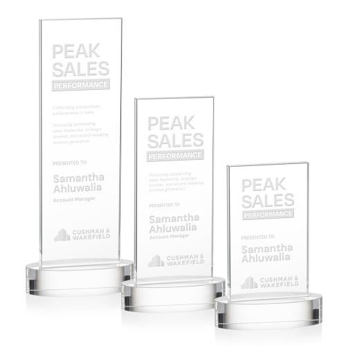 The elegant Starfire Crystal Heathrow Award features a vertical upright mounted on the optical crystal oval Alberton base. The large decorating area is optimal for achievement recognition.