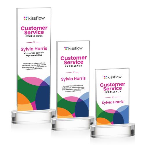 The elegant Starfire Crystal Heathrow VividPrint Award features a vertical upright mounted on the optical crystal oval Alberton base. The large decorating area is optimal for achievement recognition.