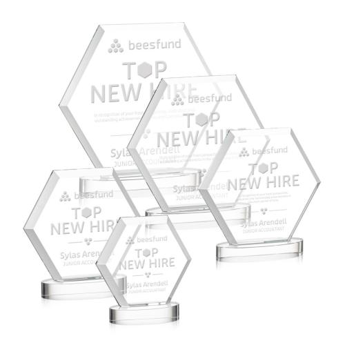 The Barnett Award features a beautifully beveled Starfire Crystal Hexagon mounted on an oval Alberton base in your choice of 9 distinct colors. The large decorating area is highlighted by the deep mitered edges that frame your outstanding achievement with refracted light.
