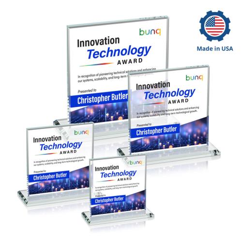 Bold Sahara VividPrint Award features a 0.5" thick Starfire crystal mounted on a vibrant flat-edged base for a spectacular work of achievement recognition. Bring your artwork to life with full-color VividPrint! **Manufactured and Decorated in the USA**