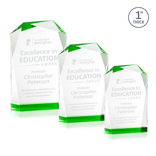 The elegant freestanding Donvale award features a modern geometric design with beveled edges and a vibrant emerald accent at the base that reflects throughout the top bevels. Crafted from optical crystal, its asymmetrical angles catch the light beautifully, creating a striking visual effect. Available in three sizes, it's perfect for recognizing excellence with a sophisticated and contemporary touch.