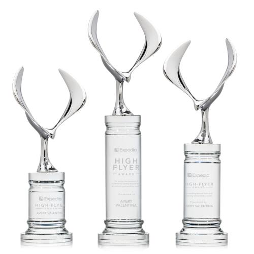 The Maverick Eagle Award showcases a soaring chrome eagle, a bold symbol of vision, freedom, and achievement. Its dynamic wingspan is elevated by a choice of elegant Optic Crystal bases, available in various shapes and finishes to suit any recognition style. This striking award makes a powerful statement, celebrating excellence with both strength and sophistication.